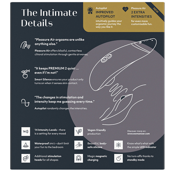 従来までのウーマナイザーと比べ、新機能を搭載したワンランク上の「ウーマナイザー プレミアム2 (ブラック)」が登場しました。吸引部分にはタッチセンサーが搭載され、ボタンを押さなくてもお肌に当てるだけで吸引♪離すだけで振動が停止。これまでのようにボタン操作の煩わしさがなくなり、より快適に楽しめるようになりました!さらに新機能のパイロットコントロールによりボタン操作をしなくても吸引の強弱を自動でコントロール。弱・中・強の3段階のレベルからセレクトでき、毎回予測できないユニークな振動が味わえます!従来品と比べて吸引振動強弱は14段階に、パイロットモード搭載(強弱3段階)、素材はシリコン/ABS樹脂で2時間のフル充電で連続4時間の使用が可能です。※製造時期によりパッケージが異なる場合がございます。※こちらの商品は受注発注商品の為、ご注文から発送までに3、4営業日掛かる場合が御座います。