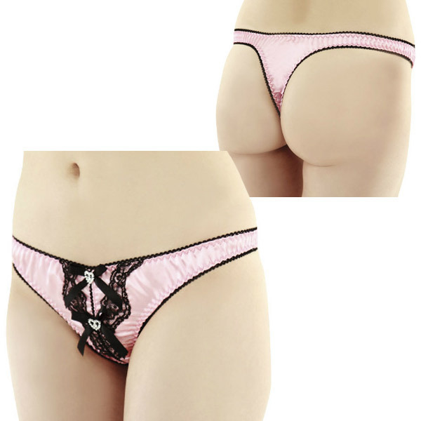 <EROX>わがままプリンセスの為のセクシーオープンショーツです。艶やかなサテンピンクが眩しいほど華やか!黒レースのコントラクトで、小悪魔感もバツグンです。姫リボンがたっぷり!※ブラジャー&ガーター&ショーツのセットは(b13346)こちら!