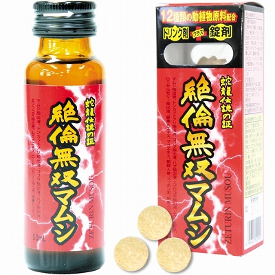 男性用ドリンク&サプリメント「絶倫無双マムシ」。12樹類の動植物原料配合。ニンニクエキスは無臭のものが使用されています。内容量:50ml+3粒入。