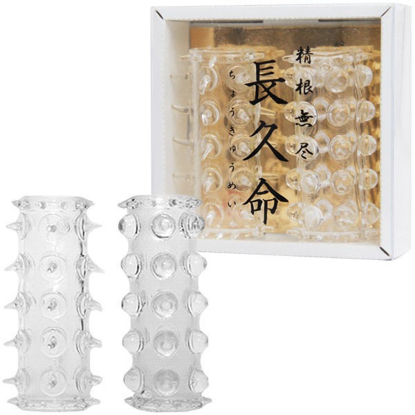 お手軽サックで早漏防止に効果を発揮!「長久命(ちょうきゅうめい)」。長めのサックは装着すると締め付け感も使用感も抜群♪丸型突起タイプと触手タイプの2タイプがセット!気分に合わせて使い分けられる長久命(サック)で、これまで自信のなかった貴方にも長期戦が可能♪ピストン運動をするたびに女性器を刺激し絶頂へと導いてくれます。今までのリングやサックで物足りなかったアナタも長久命(ちょうきゅうめい)でロングプレイを堪能してください!