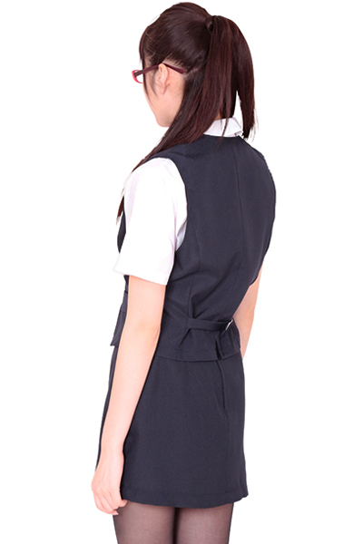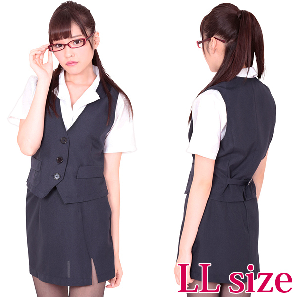 紺×白カラーが清楚なオフィスレディ風セクシーコスチューム(LL)。落ち着いた紺色が清楚な秘書の雰囲気を演出!胸元がセクシーな半袖ブラウスとミニスカートに、3つボタンベストのなりきりOLコスプレ3点セットです。※メガネは付属しません