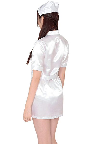 男女問わず、誰もが一度は憧れるナース服コスチューム(LL)。キラキラとした純白生地の光沢感がとってもキレイ!セクシーなミニスカートのワンピースと、ナースキャップのコスプレセットです。フロントはボタン式で下まで開きます。※Mサイズ(b15245)、Lサイズ(b18109)あります。