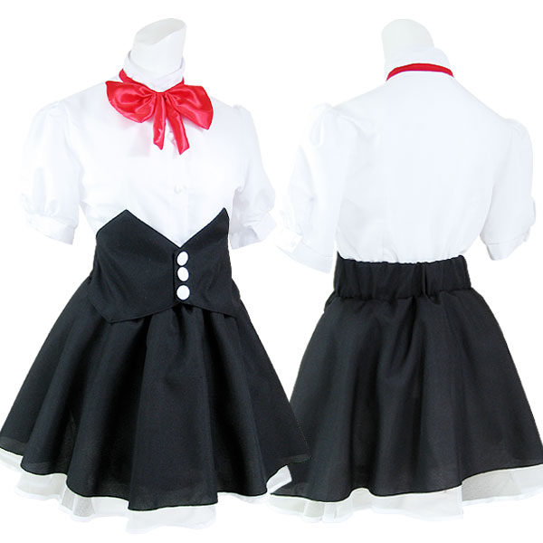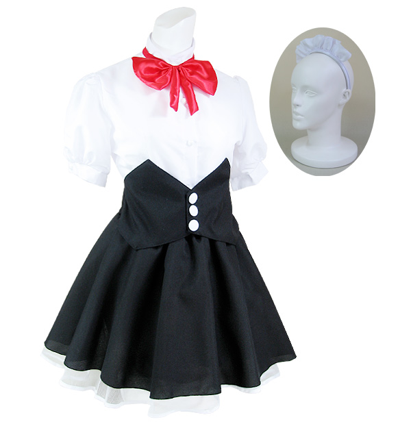 コルセット調のふんわりスカートが特徴的!赤いリボンが可愛いウェイトレス風の制服コスチューム。シャツの袖はパフスリーブになっていて、女の子らしさを惹き立てます!フリルカチューシャもセットになった、キュートなコスプレ衣装です。