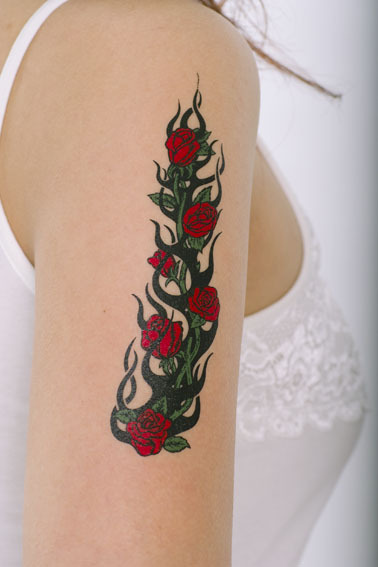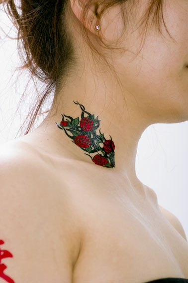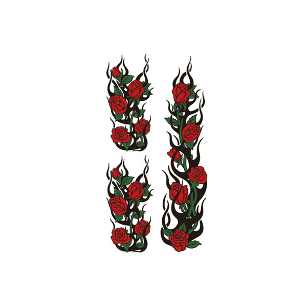 イベントやお祭りに大活躍!レギュラーサイズのペーパータトゥーシール「赤薔薇幻想」。コスチューム等に合わせて露出した肌に貼り付けるだけ!特殊な素材を使用しているので皮膚の動きと一緒に伸び縮みし、入浴したり海やプールに入っても2〜3日は取れません。祭り化粧を取る際は、専用のクリーナーやクレンジングクリーム、ベビーローション等で拭き取って下さい。