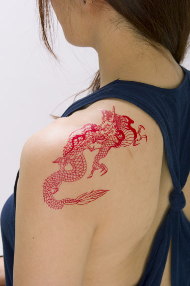 イベントやお祭りに大活躍!レギュラーサイズのTATTOOシール「線画・赤ドラゴン」。コスチューム等に合わせて露出した肌に貼り付けるだけ!特殊な素材を使用しているので皮膚の動きと一緒に伸び縮みし、入浴したり海やプールに入っても2〜3日は取れません。祭り化粧を取る際は、専用のクリーナーやクレンジングクリーム、ベビーローション等で拭き取って下さい。