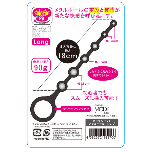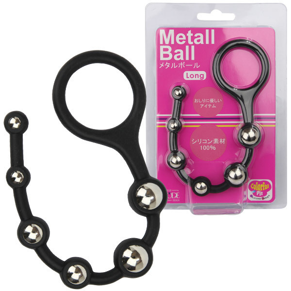メタル特有のヒンヤリ感を堪能出来るアナルグッズ「カラフルピット メタルボール ロング」。大・中・小が2つずつ連なったメタルボールを、ソフトなシリコン素材で包んだ、異素材同士のコラボによる斬新な快感!もち手リング付きで使いやすく、長めのボディで奥までラクラク!アナル上級者も大満足の使い心地が得られるアナルグッズです。