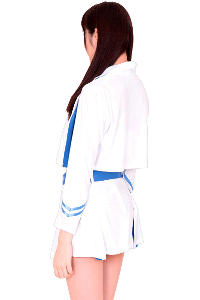 「あたしが来たからには絶対に負けないぞ!」ヘソ出し&ミニスカのセクシーな衣装で全力応援する、レースの女神様!白×水色の色使いが爽やかな印象を与える、レースクイーンコスチューム。ジャケット・スカート・ブラ・ベルトの4点セットです。
