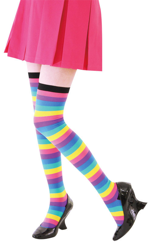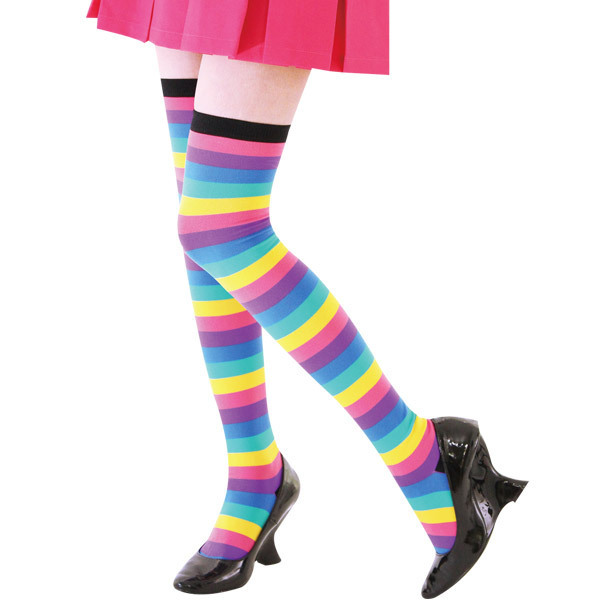 これ一足でコーディネートに怖いものなし!元気いっぱいのポップなカラーで注目の的になれる、ボーダー柄ニーハイソックス。ピンクのスカートや水色ブラウス、紫のワンピース…なんでも合っちゃう万能アイテム!60cmとロング丈で、ミニとの相性もバツグンのカラフルなニーハイソックスです。