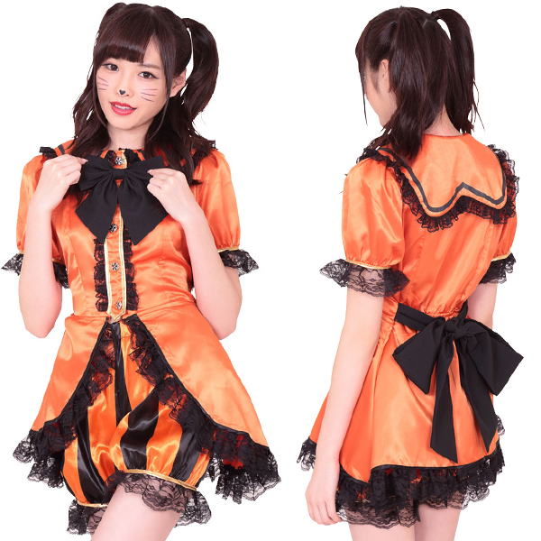 オレンジ×ブラックのパンプキン色がとっても可愛い、かぼちゃのお姫様コスチューム。●トップス・パンツ・リボンの3点セット●着脱しやすいセパレートタイプ●全体を縁取るようにあしらった黒レースが女の子らしさをUP●黒の縦じま入りのふっくら可愛いかぼちゃパンツ●キュートに決まる黒リボン。ハロウィンパーティーに打ってつけのコスプレ衣装です。