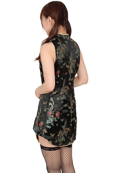 黄色でくっきりとパイピング!ダブルスリットがエロ可愛いミニチャイナ服。●黒地に縁起のよい金龍や鳳凰をプリント●こまごまとした部分に赤や青の差し色を追加●アジアンノットの紐ボタンを飾りつけて華やかさをプラス●襟元の縦スリットから谷間がチラリ●裾のダブルスリットは太股の正面が見えるセクシー仕立て。着るだけでカンフー少女っぽくなれるコスチュームです。※ストッキングは付属しません