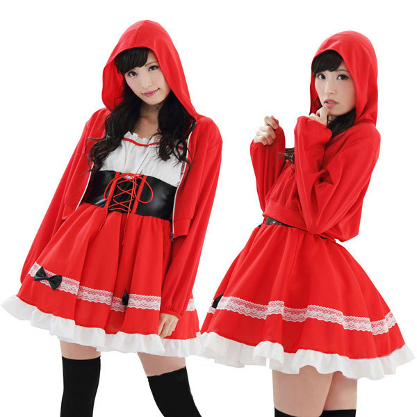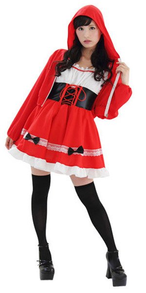 あの有名なおとぎ話の主人公になりきっちゃお!真っ赤な衣装がインパクト抜群な赤ずきん風コスチューム。●胸元ギャザー&コルセット風デザインが可愛いワンピース●赤ずきん風のフード付きミニ丈パーカー●スカート部分はレースをクルッと一周。黒のミニリボンや裾のフリルがキュートさをさらにアップ!ハロウィンパーティーが盛り上がるコスプレ衣装です。※ストッキングは付属しません。