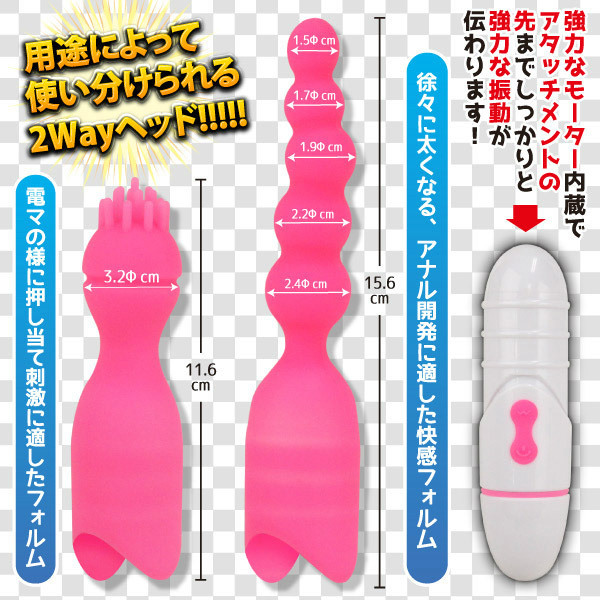その日の気分によって使い分けできる2種類のアタッチメント付き!女性向けにつくられたピンクのアナルバイブレーター。●連なる5つの凸凹ボール×刺激的なブラシ突起●2つのシリコンヘッド(付属)●エイナスヘッドは全長(本体装着時):21.2cm/最大径:2.4cm●ブラシヘッドは全長(本体装着時):17.1cm/最大径:3.2cm●強力モーター内蔵●アタッチメントの先端までしっかり伝わる12種類の振動パターン●振動は弱→強へと変化●生活防水仕様●単四電池×2本使用(底部に電池BOX)。「押し当て」&「挿入」ダブルの快感を体験できるアナルバイブレーターです。