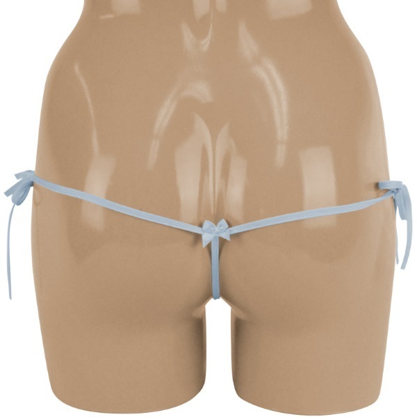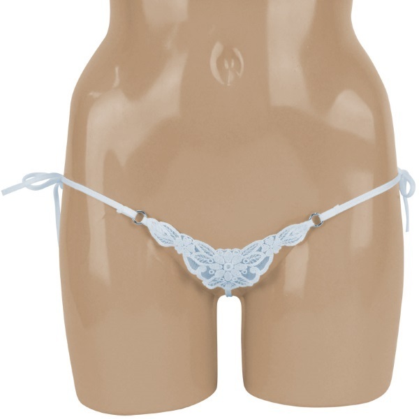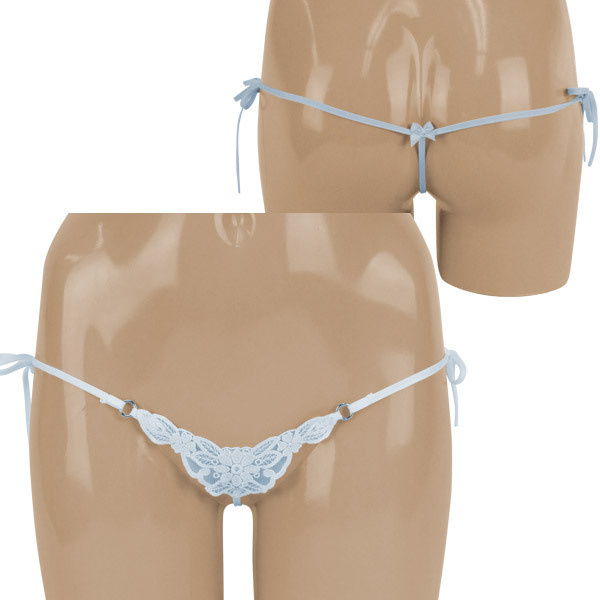 これ以上ないほどセクシー!レディな雰囲気を漂わせるレース製ショーツ。●爽やかで上品なサックスブルー●フロント部分は繊細レース仕様●両サイドをリボンで結ぶ紐パン●クロッチからヒップにかけては極細ストリング●真後ろ中央に小さなリボン付き。隠せる?隠せない?ギリギリのキワドさに一層ドキドキ感が高まってしまう女性用セクシーランジェリー。大胆さとエレガントさ、さらに絶妙な可愛らしさを併せ持つ大人仕様です。