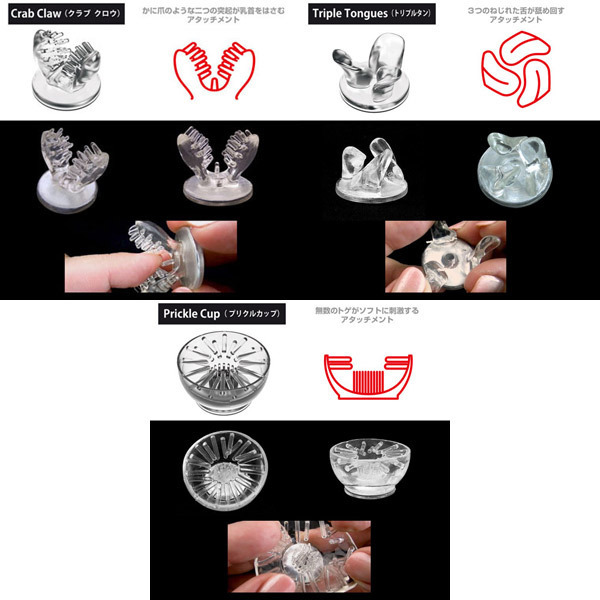 今日はどれにしようかな〜?その日の気分によって使い分けできる乳首責めグッズ用アタッチメント。●ニップルドーム専用アタッチメント(2)●左右の乳首を同時に刺激できる全5種類×2セット●肌にやさしいシリコン素材。乳首を覆うタイプや挟み込むタイプ、摘みあげるタイプがあり、様々な刺激を味わえます。もっと刺激が欲しいといったエッチな方には特にオススメの乳首用グッズです。別売りのニップルドーム本体、ブラック(b23838)、ホワイト(b23826)に装着してお楽しみください。