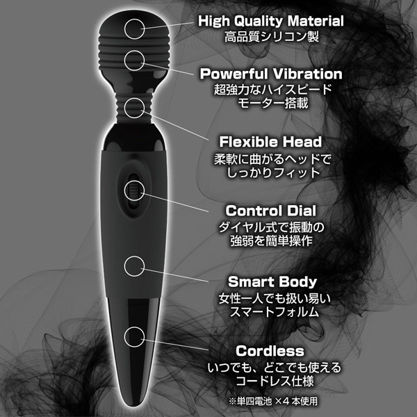 この快感にあなたはどこまで耐えられるかな♪悶絶必至のパワフル電マ。●肌にやさしいシリコン製●使い勝手のいいコードレスタイプ●柔軟にくねるフレキシブルネック●ヘッド部:超強力モーター内蔵●無段階のダイヤル式スイッチ●静音設計●単四電池×4本使用●4.5Φcmサイズのヘッド用アタッチメント(別売り)が装着可能。コード式の電マに負けないくらいのハイパワーを発揮!誰でも確実にイカす、コードレスタイプの電動マッサージャーです。