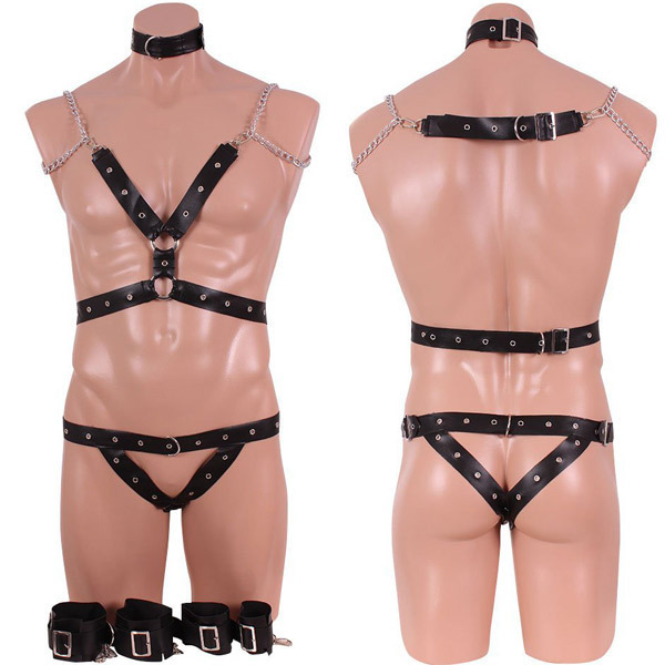 <EROX>雰囲気抜群のスタッズデザイン♪拘束感のあるメンズ用のSMボンデージコスチュームセット。●スタッズが付いたレザー風●肩チェーン付きトップス●サイド調節可のオープンショーツ●ベルト式の首枷、手枷、足枷●リング付きで連結可能。首枷やショーツ部分に通してあるリングは、手枷や足枷とジョイント可能!身につけるだけで拘束感を楽しめる遊び心たっぷりなSMコスチュームです。