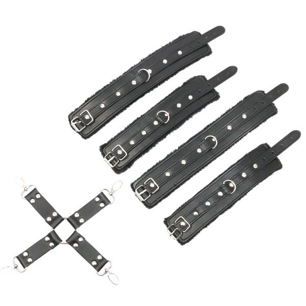 もこもこファーで優しく拘束♪両手両足を同時に拘束できるクロスベルト付きのSMグッズ。●手枷×2個・足枷×2個●外側の黒ベルトは合皮素材●内側はもこもこアクリルファー●ベルト穴式でサイズ調整が可能●手足枷同士を繋ぐクロスベルト●お肌に痕が付きにくいので安心。両手首と両足首をまとめてホールド!四肢の自由を完全に奪うSM拘束ベルトセット。内側をふわふわのアクリルファーで覆って、肌当たりの優しい仕上がりに!痛くなりにくいので、激しいプレイや長時間の着用も安心ですね。