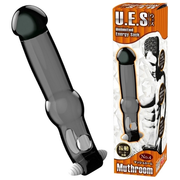 Wホールドでサイズアップ&ロングプレイ!ユニークフォルムの極厚ペニスサック「UES(ウエス)4 マッシュルーム」。●オールカバーの電動サック●先端&中間が膨らんだ「No.4」●全長19.3cm、亀頭部4.0φcm●キノコ形状の黒光りボディ●自身のサイズを約3cm延長可●極厚仕様のエラストマー素材●伸縮素材でしっかりフィット●根元を締め付ける玉袋用の穴●玉袋裏側にミニローター付属。大きく膨らんだキノコ型ヘッドでロングに変身!極厚スキンで竿全体+玉袋をガッツリ締め付けて持久力を高めながら、振動快感も得られる男性補助グッズ。付属のローターは取り外し可能ですが、電池交換不可の使い切りタイプです。