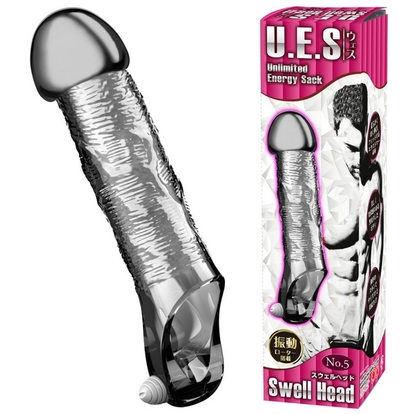 Wホールドでサイズアップ&ロングプレイ!大きめヘッドの極厚ペニスサック「UES(ウエス)5 スウェルヘッド」。●オールカバーの電動サック●先端が大きく膨らんだ「No.5」●全長15.5cm、亀頭部3.3φcm●大きめ先端の黒光りボディ●極厚仕様のエラストマー素材●伸縮素材でしっかりフィット●根元を締め付ける玉袋用の穴●玉袋裏側にミニローター付属。ぷっくりと盛り上がった大きめヘッドで高刺激なファーストインパクトを!極厚スキンで竿全体+玉袋をガッツリ締め付けて持久力を高めながら、振動快感も得られる男性補助グッズ。付属のローターは取り外し可能ですが、電池交換不可の使い切りタイプです。