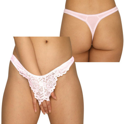 > トリコット&レース生地オープンクロッチTバック ピンク