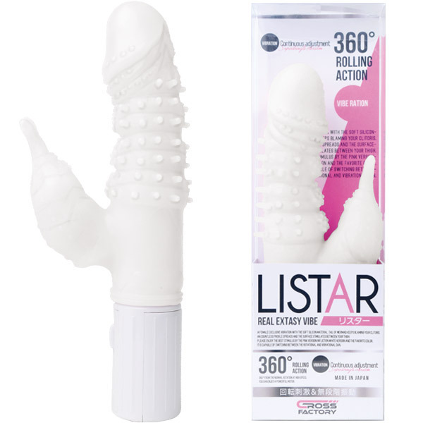 つぶつぶボディが振動&回転!イボ突起付きスイングバイブ「リスター ホワイト」。●キュートなホワイトカラー●もちもち質感のエラストマー素材●亀頭を模したリアルヘッド形状●大量のイボ突起が並ぶシャフト●舌のような先端突起のクリバイブ●子機に強力な振動モーター搭載●振動&回転は個別で調整可能●楽々な無段階スライドスイッチ●単四電池×3本付属(動作確認用)。膣内を掻き回しながらクリトリスをツンツン刺激!無数のイボが快感ポイントをムラなく刺激するパワフルバイブ。高刺激ながらもちっと柔らかなシリコン素材で女性に優しい仕上がりです。