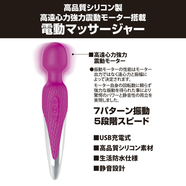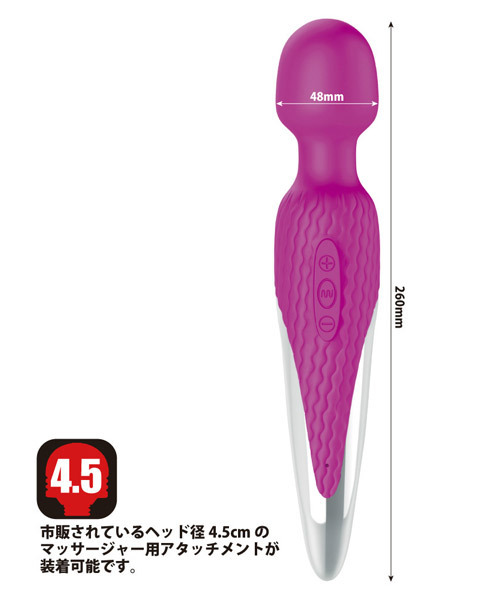 超強力振動でも静音性抜群!全長26cmのハンディサイズ電マ「プリティラブ パワフルワンドマッサージャー」。高遠心力モーターで驚愕のパワーと静音性の両立を実現した電動マッサージャー。7種類の超強力バイブレーションと5段階のスピード調整が可能、USB充電式(専用コード付属)&生活防水仕様でいつでも清潔に使えます。『プリティラブ』シリーズのデンマキャップだけでなく、フェアリーミニ専用アタッチメントなど市販されているヘッド径45mmの電マアタッチメントも装着可能です。