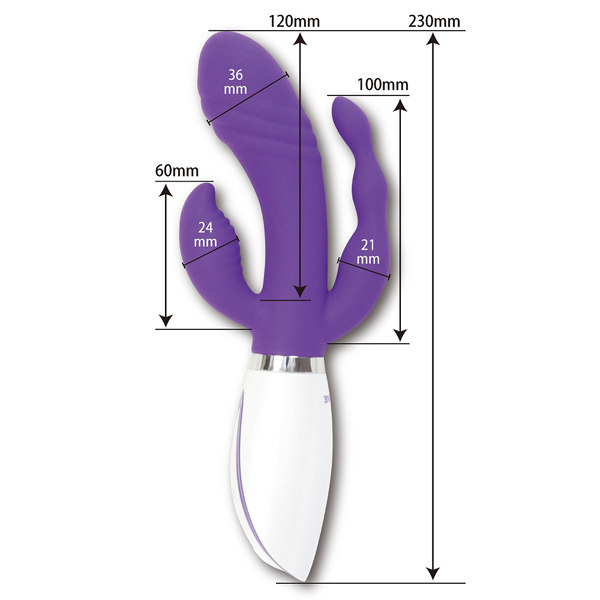 パッケージ:24.0×10.0×5.0cm 本体:全長23.0cm・クリバイブ6.0×2.4cm・ヴァギナバイブ12.0×3.6cm・アナルバイブ10.0×2.1cm 重量:220g USB充電式