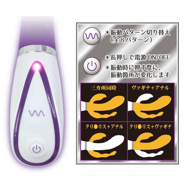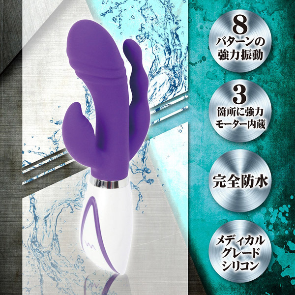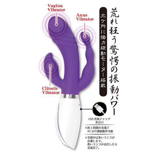 荒れ狂う驚愕の振動パワー!3点同時責めで確実にイかせる超強力バイブレーター「SENSUAL TRIDENT」。Cスポット、Gスポット、アナルの3ヶ所それぞれに強力な振動モーターを内蔵!全8パターンの振動切り替えと振動箇所の切り替えができるので、お好きな組み合わせで様々な刺激を楽しめます。芯まで響く快感振動で味わったことのない程の絶頂へと誘うトリプルバイブ。医療グレードシリコンを採用した生活防水設計、約2時間のフル充電で45分の連続動作が可能なUSB充電式(コード付属)です。