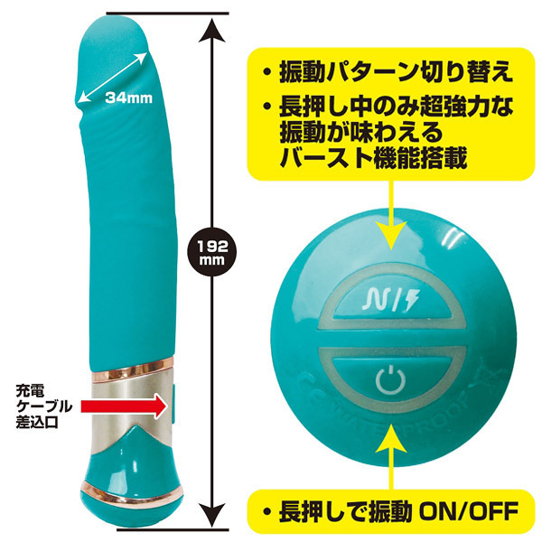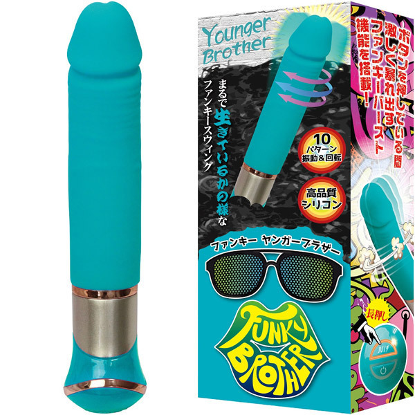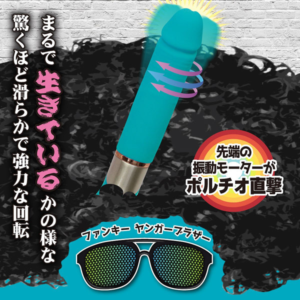 まるで生きているかのよう!滑らかすぎる快感スウィングの一本式バイブ「ファンキーヤンガーブラザー」。高品質なメディカルグレードシリコン素材を採用したリアルなペニス型のストレートボディには、10パターンの振動+スイング機能に加え、ボタンを押している間だけ超強力に暴れまわるバースト機能を搭載。さらに、亀頭部に内蔵された強力モーターによる振動でポルチオを刺激する通常回転から、生き物のような予測不能の小刻み回転まで楽しめます。USB充電式(コード付属)。