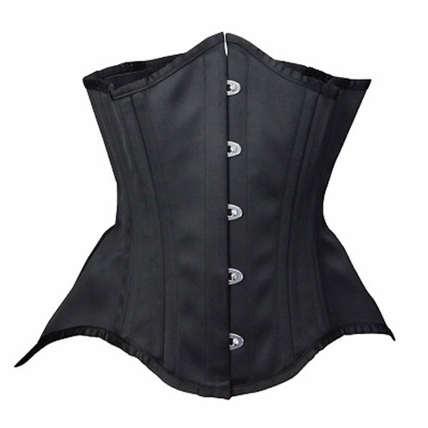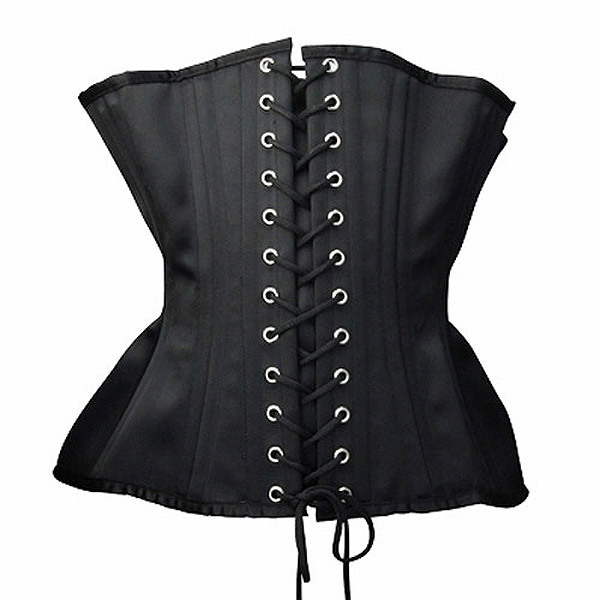しなやかに曲がるボーン(骨)でくびれラインを美しく演出するSMボンデージコスチューム「ブラックサテン アンダーバストコルセット」。ボーン(骨)を24本内蔵、フロントはホック仕様、バックの編み上げ紐で調節可能なフリーサイズです。※モデル着用のニップルタッセル、ショーツ、ストッキング等は付属しておりません。