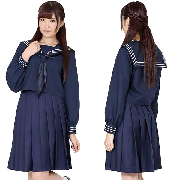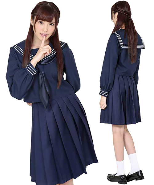 大人っぽい紺色のセーラー服「学校制服 typeつつじ」。コスチュームの定番!ともいえるセーラーコスチュームは襟と袖口に3本ラインが初々しさも感じさせる制服です。プリーツスカートでキュートさも表現され、丈の長さも程よくコスプレ初心者にもお勧めです。