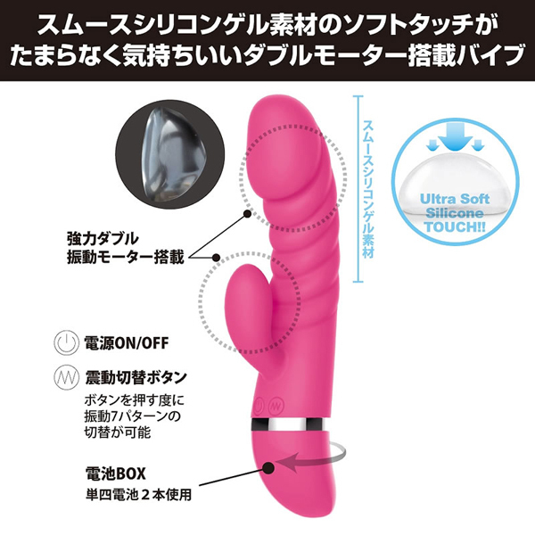 今までにないような最高の弾力感が、貴方の中で深く振動する高性能のバイブレーター。先端からちょうど真ん中までがグミのような人肌に近い素材のシリコンゲルを使用しており、挿入した瞬間からその柔らかく心地よい弾力感が通常のバイブとは異なった挿入体験をさせてくれます♪胴体は波打つようなウェーブデザインで、出し入れするたび膣壁を擦りあげ、さらに先端と子機に内蔵された強力なモーターが7パターンの振動で外・内を同時に刺激。面倒な操作は要らず、1つのボタンをポチポチっと押すだけでパターン変更できるから、好みの振動で目一杯お楽しみいただけます♪また、生活防水機能を搭載しているのでお手入れも楽々。扱いやすく大激震!ただのシリコン製バイブじゃない、実物ペニスのような肉感をぜひ体験してみてください♪