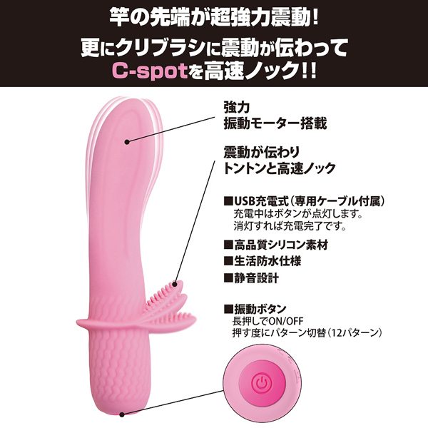太さ最大3cmのぽっこりヘッドがGスポを直撃!内蔵されたモーターから伝わる強力振動で、細かな突起のついたブラシがクリトリスを高速で叩く♪ピンポイントで同時刺激することで「アッ」という間に絶頂快感へといざなうパステルピンクの可愛らしいUSB充電式バイブレーターです。素材には手触り滑らかなシリコンを採用することで心地よい刺激を実現!12パターンもの豊富な振動が搭載されているから、個人の身体に合わせた振動でお楽しみいただけます。USB充電式(専用ケーブル付き)、生活防水を搭載。