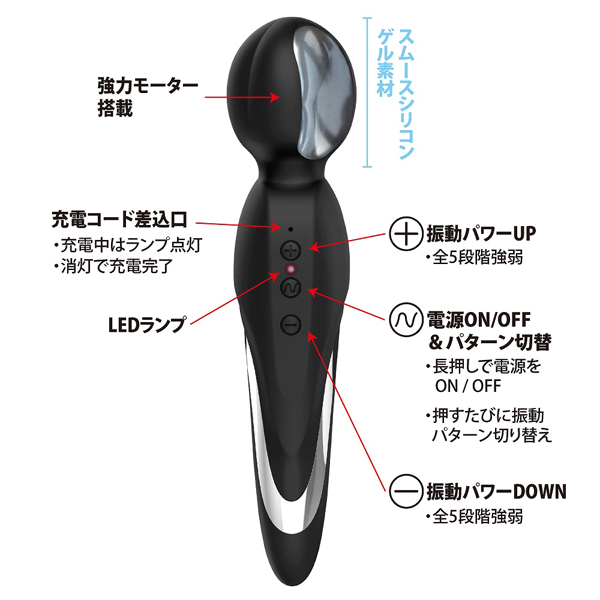 「当てすぎて痛くなる…」といった女性の悩みから生まれたのが、このシリコンゲル内蔵のUSB充電式デンマ。直ぐにイッてしまうほど力強いのに、ハリのある気持ち良いぷにっと質感のヘッドが身体の負担を軽減、最後までジンジンと痛むことなくお使いいただけます♪本体には7種類の振動パターン×5段階の強弱から選べる高性能モーターを搭載し、生活防水付きでメンテナンスも楽チン!約120分の充電で、およそ90分の稼働が可能です。プリティラブのデンマと言えば「パワフルワンドマッサージャー(b25828)」も人気ですよ♪