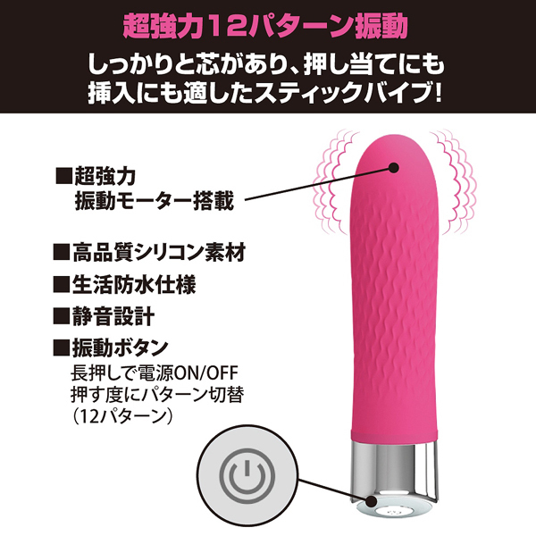 「リモートエッグ2 ストロベリー(b25686)」や「スティックバキューマー2(b26471)」等の吸引グッズでお馴染みのプリティラブより新登場!直当てや挿れるのに最適な、大きさ約12.5cmの小型ストレートバイブ。単3電池1本で強力振動が楽しめて、内蔵されたモーターには12パターンもの振動を搭載!柔らかなシリコンボディで身体の負担を抑えつつ奥まで振動を届けてくれますし、芯がしっかり通っているので中に入れても気持ちいい♪本体の底面を回せばスグに電池交換可、生活防水でお手入れ楽々!場所問わず楽しみたい方に♪