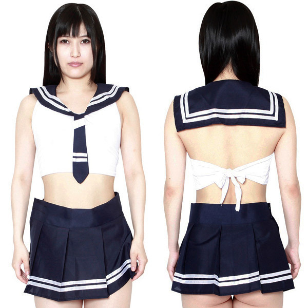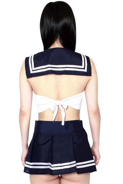 ネイビー×白の定番セーラー服を色気たっぷりに仕上げた、後ろ結びミニ丈トップスとマイクロ丈プリーツスカートの2点セット!セーラー服特有の大きな襟と、ボックスプリーツスカート、そして紺色のネクタイには太目の白ラインを2本施しています。全体的に露出度高めのデザインはカップルや夫婦でのお楽しみにピッタリです♪