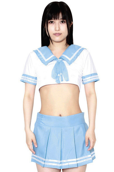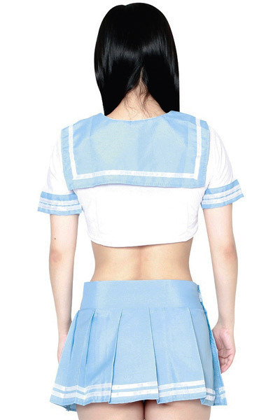 パステルブルーの淡い色味が可愛いミニ丈セーラー服コスプレ。短めトップスから見えるおヘソや背中にドキッとしちゃう!ストレッチトップス+ミニスカート+Tバックがついた3点セットです♪