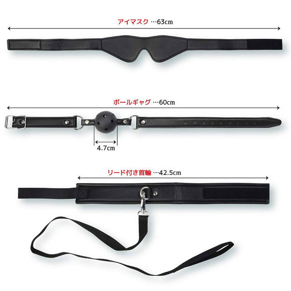 フリーサイズ パッケージ:31.0×19.0×7.5cm セット内容:アイマスク、ボールギャグ、リード付き首輪、手枷、バラムチ