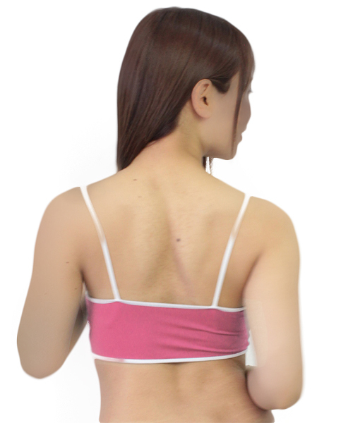 肌触り良く伸縮性のあるストレッチ生地を白のパイピングで縁取った可愛らしい日本製ブラ(ピンク)。スポブラのように胸全体を覆うデザインは、リラックスタイムや運動する際のインナーとして最適!