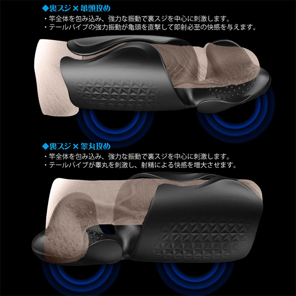 上下に内蔵された2つの振動モーターでサオ全体を包み込み強力振動!男を唸らせる究極の電動マッサージャー(USB充電式)。10種類の豊富な振動パターンを搭載!覆う向きを変えれば「裏筋×亀頭」「裏筋×睾丸」といった好みの部分を重点的に刺激できる♪肌に優しいメディカルグレードシリコン素材を使用、お手入れしやすい生活防水!充電後60分の連続稼働が可能です。