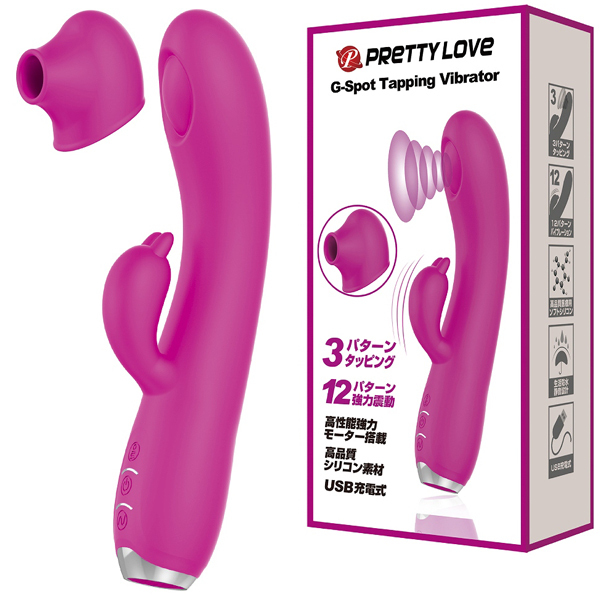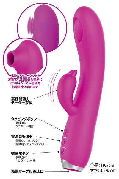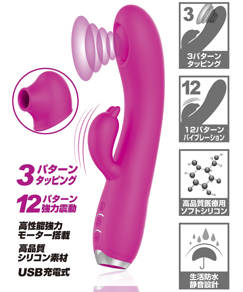 敏感ポイントを激しくノックするように刺激するUSB充電式バイブ(ピンク)。Gスポをトントントン、とリズミカルに叩くタッピング機能と12種類の豊富な振動パターンを搭載!Gスポから伝わる恥骨振動で夢の潮吹き体験も!?素材には肌ざわり滑らかな高品質医療用シリコンを採用、お手入れしやすい生活防水、静音設計。付属アタッチメントで違った刺激もお楽しみいただけます。