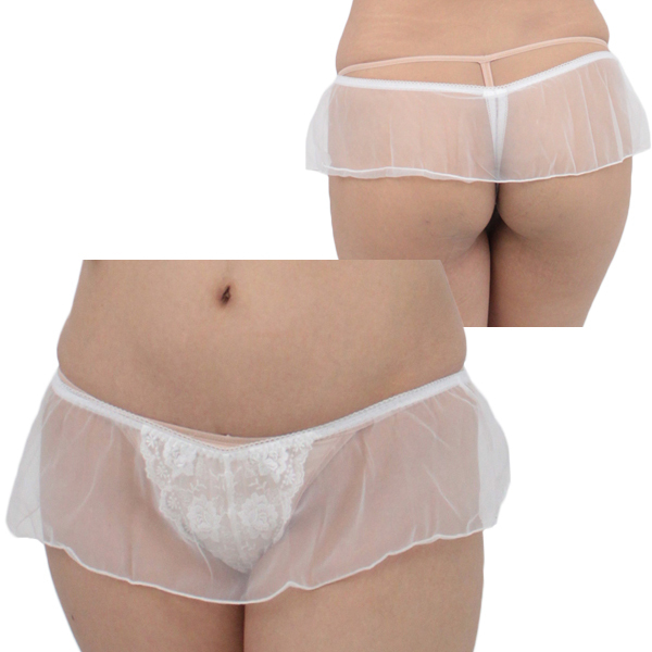 動くたびヒラリと揺れる♪可憐なレース刺繍のTバックとシースルースカートが一体型になった日本製セクシーショーツ(白)。レースの先に見えるTバック姿に美しくもエロスを感じさせるデザイン!ここぞという夜に着用したい一枚です。