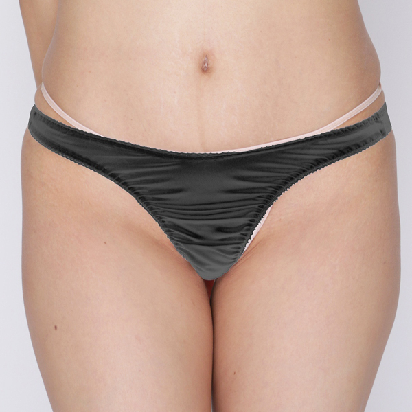 シンプル無地で普段使いにも最適!上品な光沢のあるストレッチ生地を使用した日本製のTバック(黒)。伸びの良い生地が身体に程よくフィット!丁寧な縫製で仕上げたシンプルTバック大きめサイズ。
