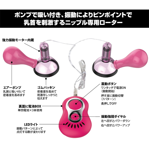 ポンプで吸い付き、縁についたゴムパッキンでピッタリ密着!7段階の振動で乳首をピンポイントに責め立てる電池式ニップルローター。強弱はダイヤル調整式、振動切り替えはワンボタンの簡単操作!パターンが見てわかるLEDライト付き。単四電池を3本使用