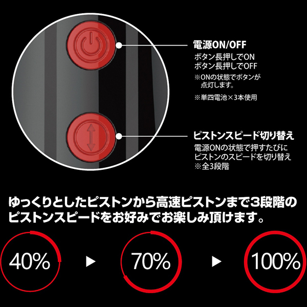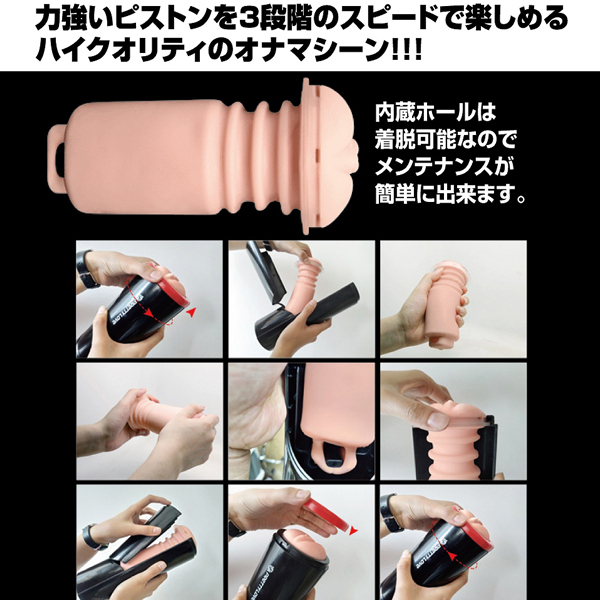 3段階のスピードで強力ピストンを味わえる!プリティラブシリーズに黒×赤の洗練されたデザインが特徴的な電動オナホが登場(単四電池を3本使用)。ゆっくり〜高速まで、ボタン一つで切り替え可能!使用後はインナーホールを取り外せるのでメンテナンスも簡単です。生活防水製