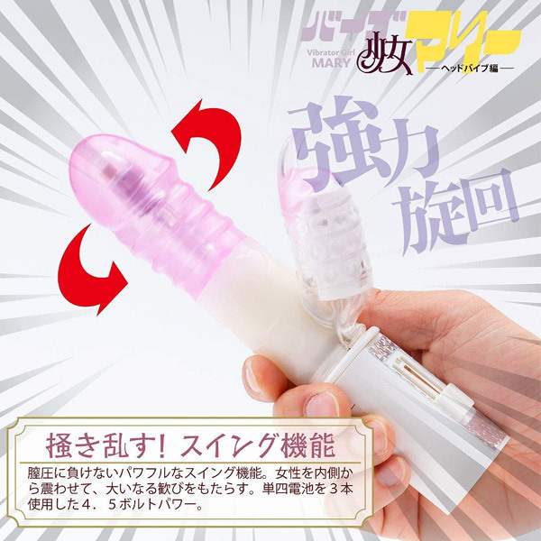 バイブ少女マリー、ヘッドバイブ編はワイドな面でクリちゃんを責めるスイングバイブです。大きな面でクリトリスを集中して刺激、しっかりとパワーを伝達します。またスイングは膣圧に負けないパワフル仕様、内側から女性を掻き乱します。本体先端には強力なヘッドバイブを搭載、これによりジンジンと響く様な刺激を実現しました。●無段階強弱調整