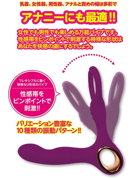 男女問わず使える!同時責め可能な強力Wモーター搭載の軽量型USB充電式バイブ。手触り滑らかで丸洗い可能な高級シリコンを使用!U字形状のボディは柔らかなフレキシブル仕様と10種類の振動パターンで、敏感な部分をピンポイントに刺激する♪乳首や女性器、男性器、前後ろ問わず楽しめる万能バイブです。