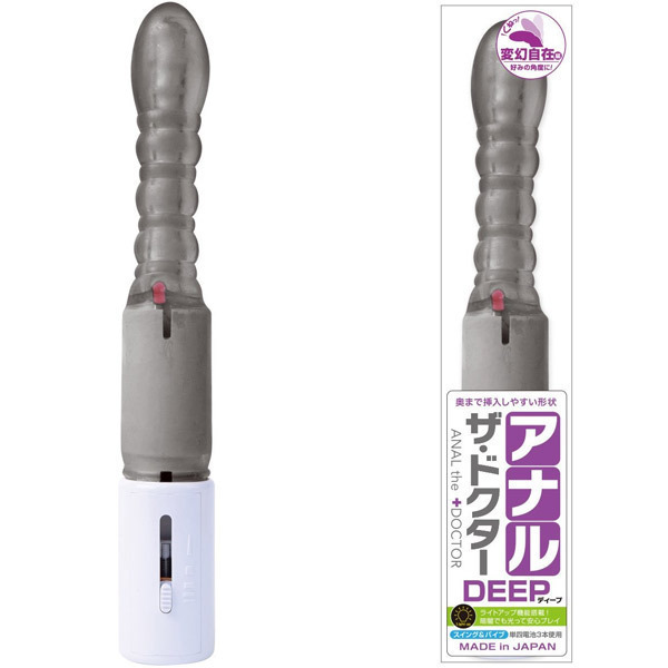 くねっと曲げて刺激!アナル開発に最適な人気のアナルザドクターから「アナル・ザ・ドクター ディープ 変幻自在編 スモーク」が登場。奥まで突けるストレートボディの『ディープ』は丸みを帯びたエッグ型の先端部と、細いリングと太いリングを交互に連ねたようなポコポコフォルムが特徴。バイブレーションはスライドスイッチで簡単に調節可能!暗闇で使うと幻想的な雰囲気を楽しめるライトアップ機能も搭載されています。単四電池3本付属。※仕様変更によりスイング機能は搭載されておりません。