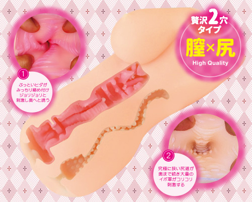 たわわなバストは揉み応え抜群!正常位もバックも堪能できる2穴構造の贅沢な非貫通型オナホールです。生肌感たっぷりのもっちり素材にナカはピンクの二層構造!ただ挿入して楽しむだけじゃなく、ボディのバスト部分を使ってのパイズリや座位、正常位はもちろん、バックも楽しめるので尻ズリなんかも体験できる重量1450gの大型オナホールとなっています。挿入口を抜けると太いヒダヒダがみっちりと締め付けながらあなたを襲い、奥に進むと不規則な突起構造とヒダが絶妙な刺激を与えてくれます!バックで楽しめるアナル側のアナル穴は、キツキツの湾曲した細長い穴が奥まで続き、アナルの壁には大量のイボイボが敷き詰められているので最初から最後までコリコリとした刺激を楽しめます。大型ホールとしてはもちろん、アナル系ホールとしても充実感がある快感プレイをぜひお楽しみください!ローション付属。