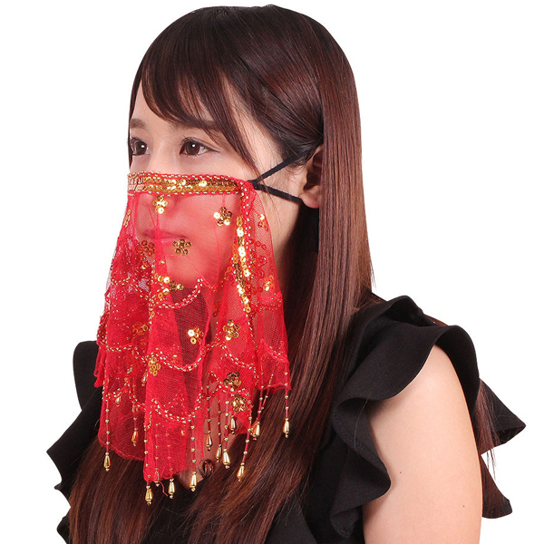 ベリーダンスやアラビアン衣装のコーデアイテムに、通気性の良いレース素材を使用したキラキラ煌めくナイトマスク。真っ赤なシアー素材に金のスパンコールを装飾した豪華なフェイスベール♪顔周りを華やかに魅せたい時に◎耳紐長さ調整式、不織布フィルター1枚※こちらの商品は受注発注商品の為、ご注文から発送までに3、4営業日掛かる場合が御座います。